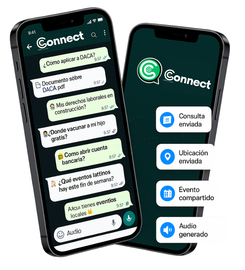 Latins Connect es tu nuevo asistente inteligente en español, creado para ayudarte con lo que necesitas como latino en EE.UU. Respuestas confiables, acceso a recursos y acompañamiento humano, cuando más lo necesitas.